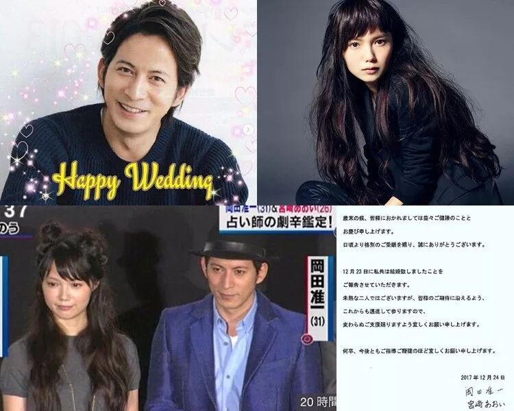 日本男团V6的37岁成员冈田淮一,跟32岁女星宫崎葵透过传真,亲自向传媒公佈婚讯:「我们结婚了!」