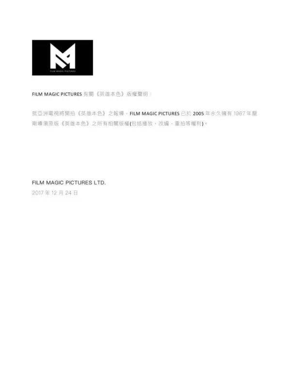 到今日,轮到重拍《英雄本色》出现暗涌,影星冯德伦的FILM MAGIC PICTURES发出声明,指他们已于2005年永久拥有1967年龙刚导演原版《英雄本色》之所有相关版权(包括播放、改编、重拍)。