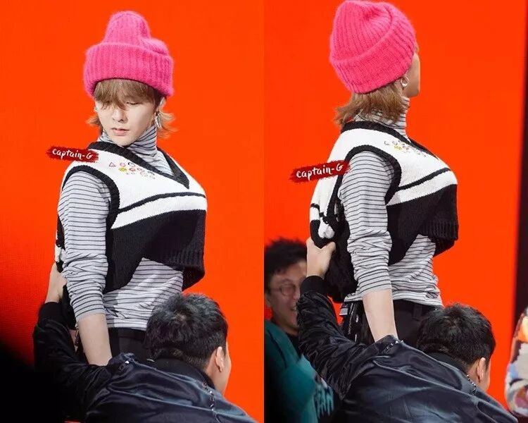 韩国天团BigBang在日本大坂举行巡演同时,今日还举行粉丝聚会,在完成游戏后,队长G-Dragon(GD)罕有地成为赢家,但今次奖品是超搞笑的「性感女模拍照」,老么胜利就帮拖在GD胸前「装假狗」,由于GD在简条T恤外罩阔身背心,胜利就在背后为GD抓紧背心,由阔身变贴身,GD亦摆出性感诱人甫士,笑爆全场。