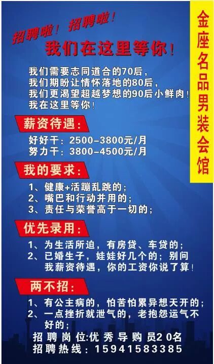 金座名品男装会馆现招聘导购20名,迎宾一名(要求形象好,气质佳,喜欢微笑的,说话声音好听的)有意者电话联系,15941583385 地址:西丰联通公司二楼 (?森禾商贸?大唐?:15042082888)