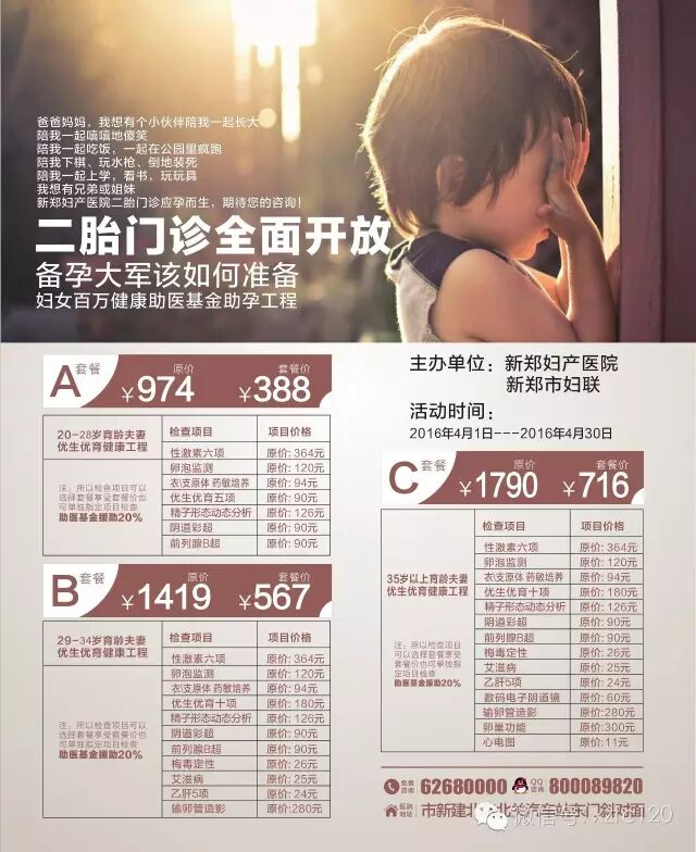 为帮助众多家庭早日圆梦,新郑妇产医院特推出不孕基础体检等一系列检查优惠套餐,给各位准妈妈们提供最贴心安全的服务!