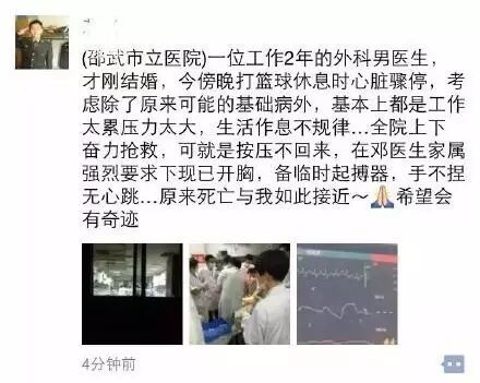今天微博网友@qlj缡洛称,邵武市立医院一位25岁的外科男医生,才刚结婚,妻子怀孕3个月,今傍晚打篮球休息时心脏骤停,考虑除了原来可能的基础病外,基本上都是工作太累压力太大,生活作息不规律…全院上下奋力抢救6小时,无力回天,一路走好。。。