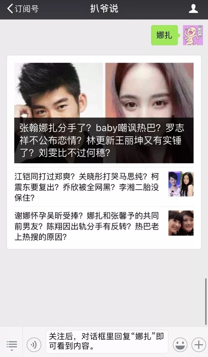 心动的小婊贝们,赶快扫描二维码关注扒爷说,关注后微信对话框回复关键词“娜扎”,即可查看扒爷为大家准备的详细爆料。