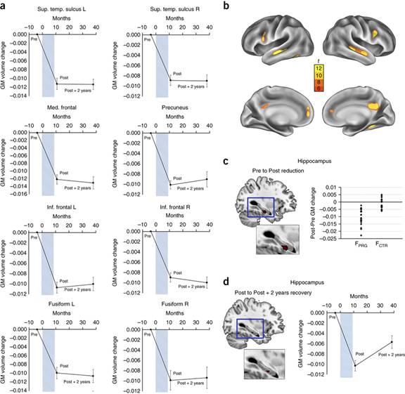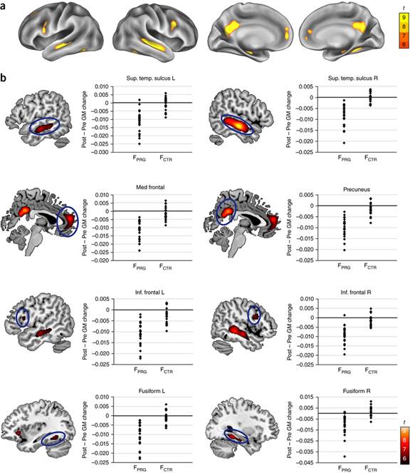 本周在线发表于《自然-神经科学》的论文Pregnancy leads to long-lasting changes in human brain structure对25位初次生育的母亲进行了研究,发现怀孕会在至少两年内导致大脑的结构性改变,主要导致在产后两年多的时间内与社会认知有关的区域内灰质减少。另外,母亲对其婴儿的图像做出反应的区域也会发生改变,影响母亲对孩子的依恋程度。