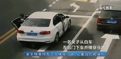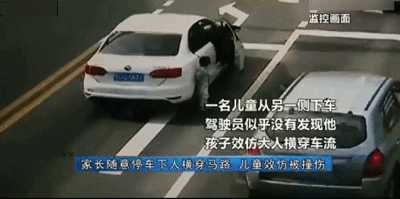 前不久,江苏溧阳市区发生了一起惊险的交通事故。一辆白色小轿车在十字路口随意停车,车上一名女子从左后门下车并横穿马路。与此同时,惊险的一幕发生了:轿车副驾驶的车门被打开,一名儿童下了车。驾驶员似乎没有注意到这一情况,竟然发动汽车前行。随后,这名孩子有些惊慌,只好效仿大人横穿马路,被一辆黑色小轿车“撞飞”。幸运的是,小孩仅受轻伤,经过救治,已无大碍。