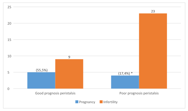 在我们的研究中,有32位3型肌瘤患者被纳入其中。在所有的患者中,在排卵期和“着床窗口期”,都进行了基于计算机的子宫蠕动分析。在这组患者中,有23名女性“不良妊娠预后”,9名患者“预后良好”。经过一年的备孕, 9名“预后良好”中有5例怀孕(55.5%),23例“预后不良”的妇女中只有4例(17.4%)怀孕,具有统计学上显著的差异(P=0,01)。