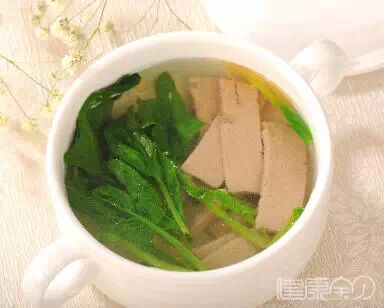 材料:菠菜500g,猪肝150g,油、猪骨汤各适量