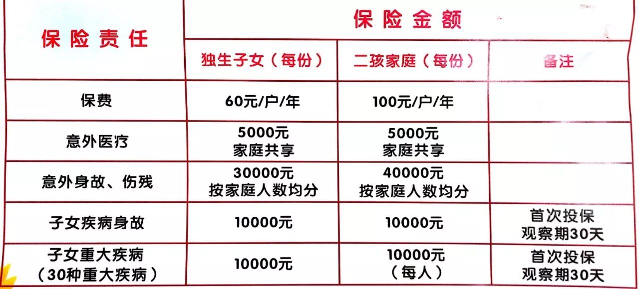 答:凡有子女在0-18周岁,符合国家计划生育政策的家庭,以家庭成员(独生子女和父母双方)和天府新区支公司投保,独生子女家庭每份60元/年,二孩家庭100元/年,最多可以投保两份。
