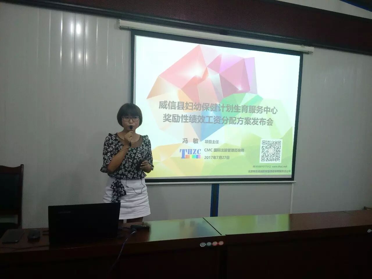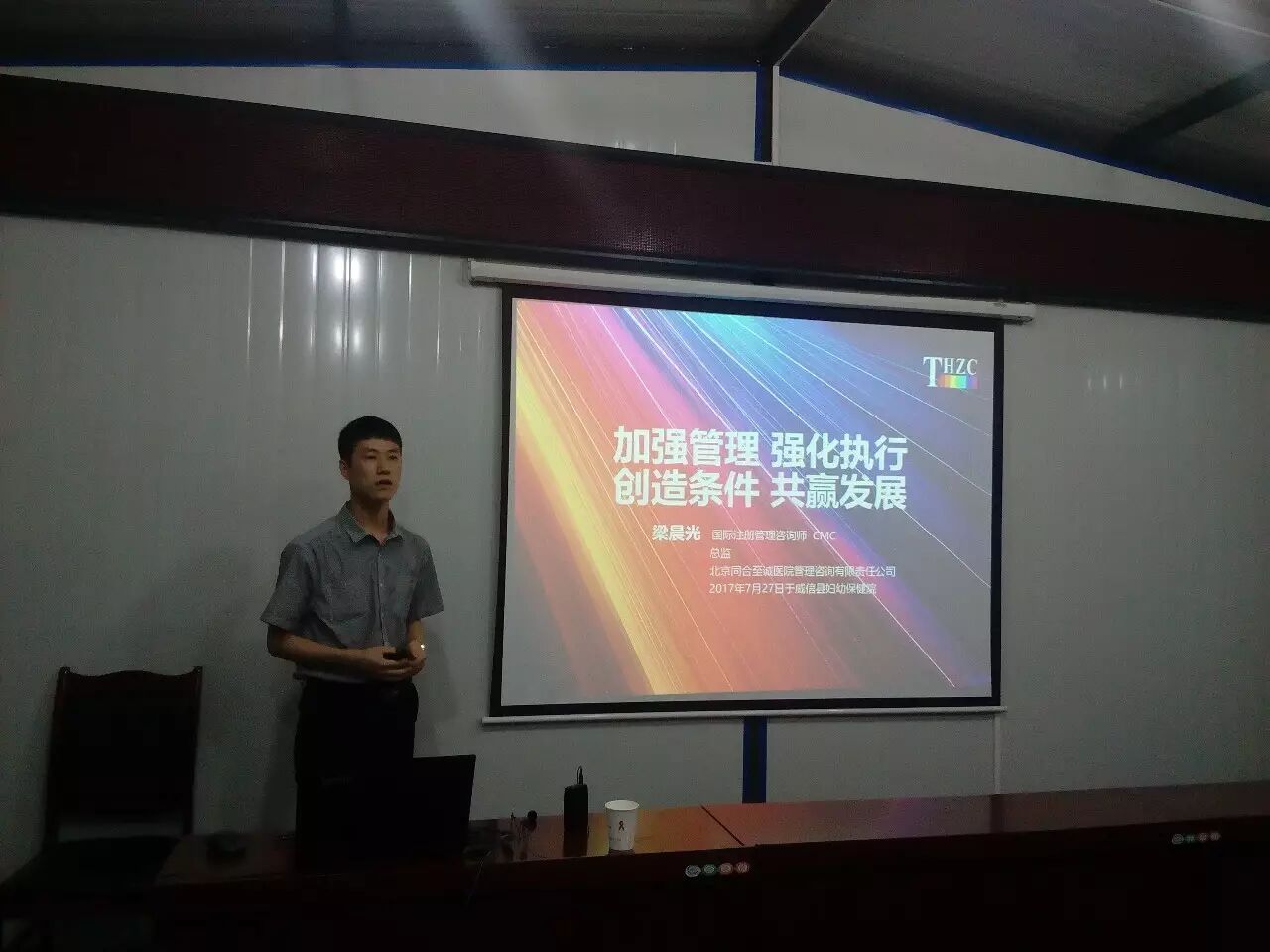 2017年7月27日19:00北京同合至诚医院管理咨询有限责任公司威信妇幼项目组在四楼会议室为医院全体职工发布了奖励性绩效工资分配方案,并做了《加强管理强化执行,创造条件 共赢发展》的专题讲座。