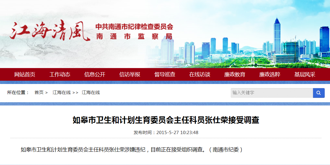 5月27日,中共南通市纪律检查委员会、南通市监察局官网“江海清风”发布消息称:如皋市卫生和计划生育委员会主任科员张仕荣涉嫌违纪,目前正在接受组织调查。原帖如下: