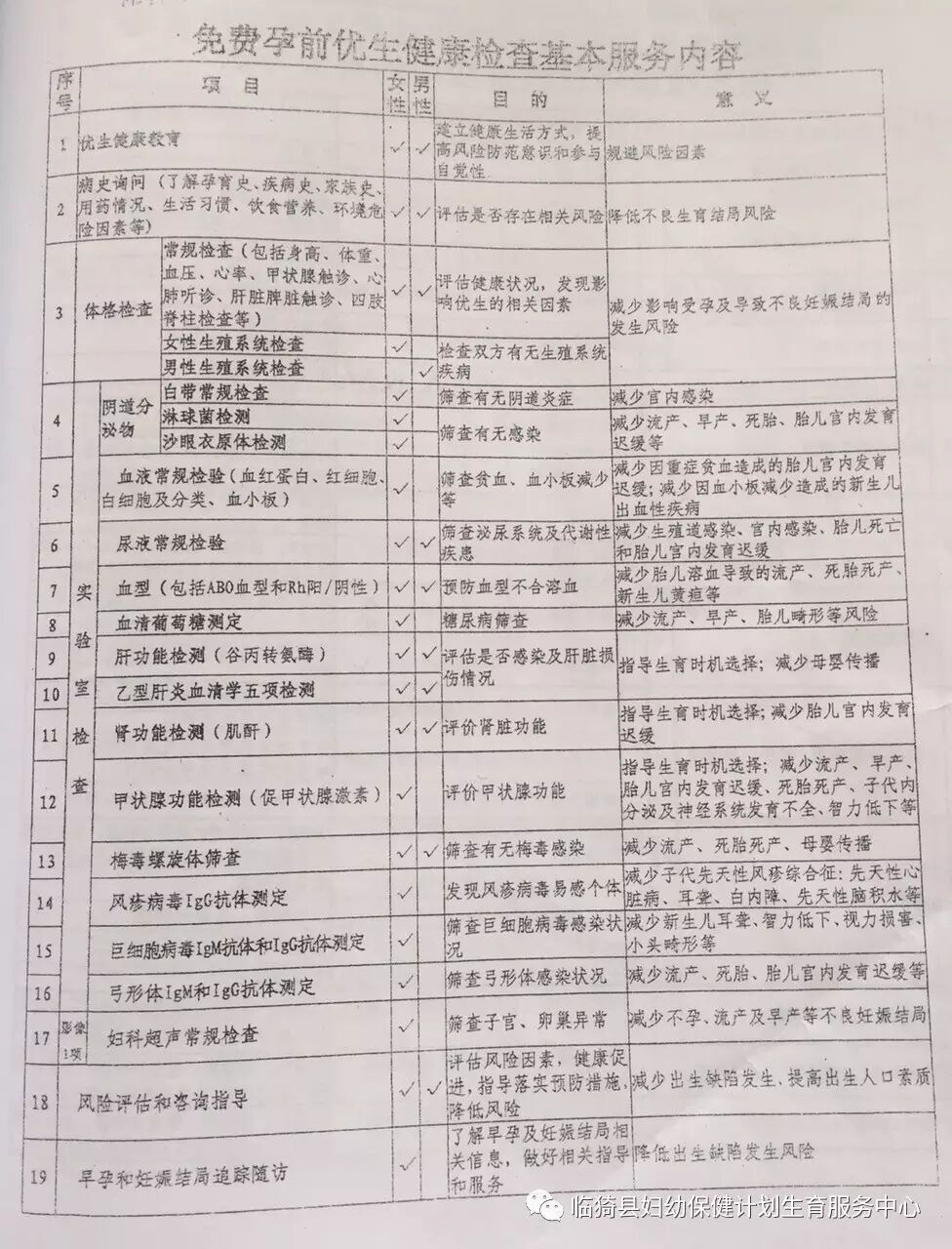 检查对象:全县所有符合国家生育政策且准备怀孕的农村夫妇。