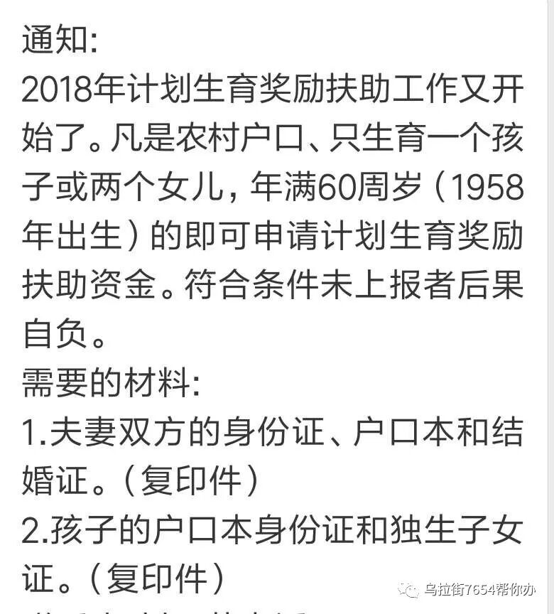 1有一个通知,大家看一下,关于2018年计划生育奖励扶助的好事!这个通知是在我所在村的群里看到的,消息准确!符合条件的微友可以和村里相关领导联系,确认详细情况! 7654对这方面不懂,大家不要问我啊!