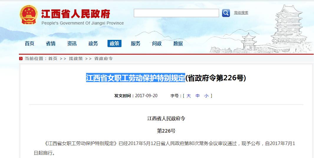 前段时间,鸽相继给大家介绍了,我省女性享受的各项优惠,比如可领取生育津贴,还有两孩的相关规定,很多女性朋友,提出了各种问题,希望得到解答,现场鸽查阅相关资料,了解到我省已经公布了《江西省女职工劳动保护特别规定》,里面对于女性的各项保护非常详尽,还不清楚的赶紧看过来。