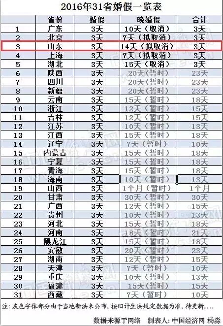 据了解,山东原先晚婚假有14天,加上固有的3天婚假,晚婚者一共可休17天。但如今在新条例中,拟删除了“男女双方晚婚的,除了国家规定的婚假外,增加婚假14日”的规定。也就说,以后不管你是否晚婚,只能休那固有的3天假期。