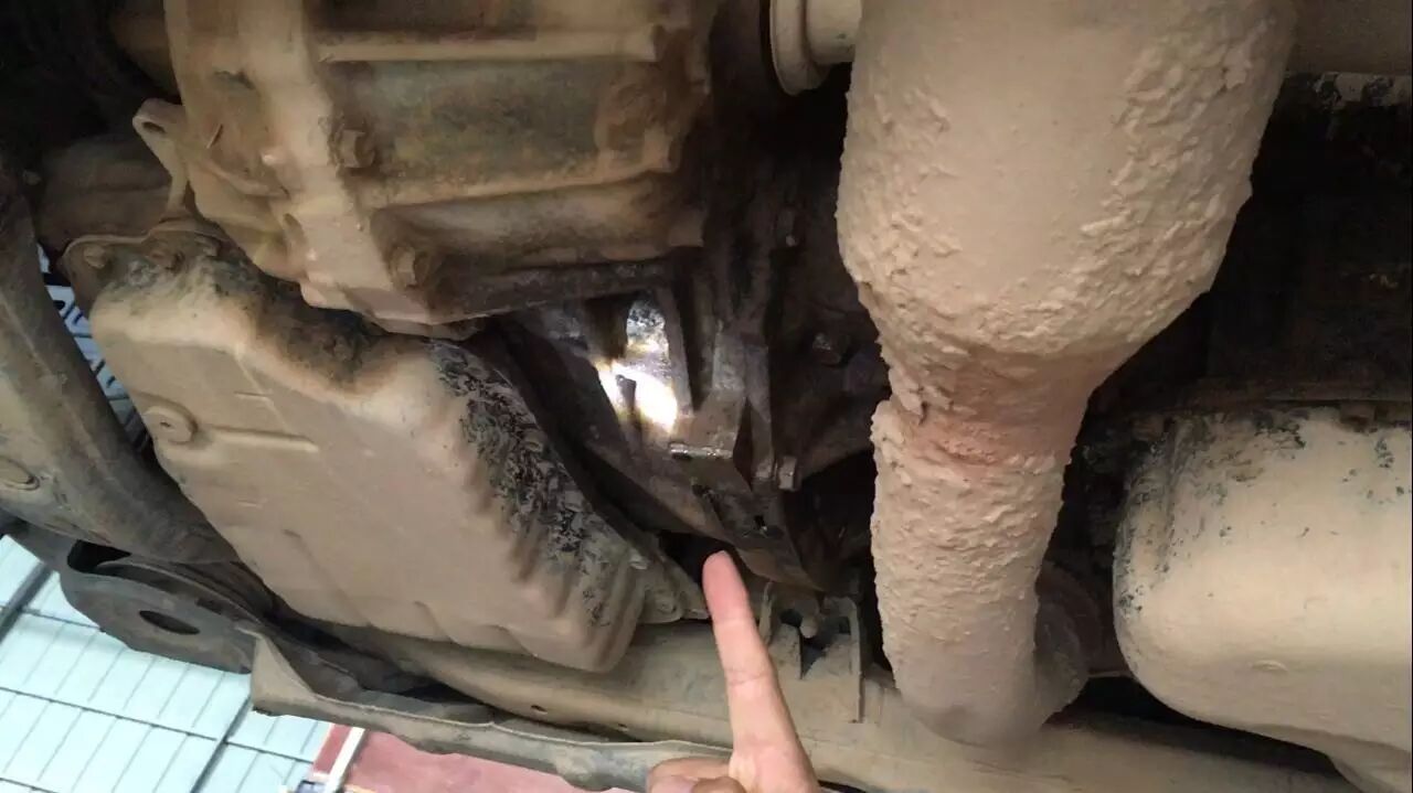 在这辆汉兰达变速器与发动机的连接部有明显的渗漏油。
