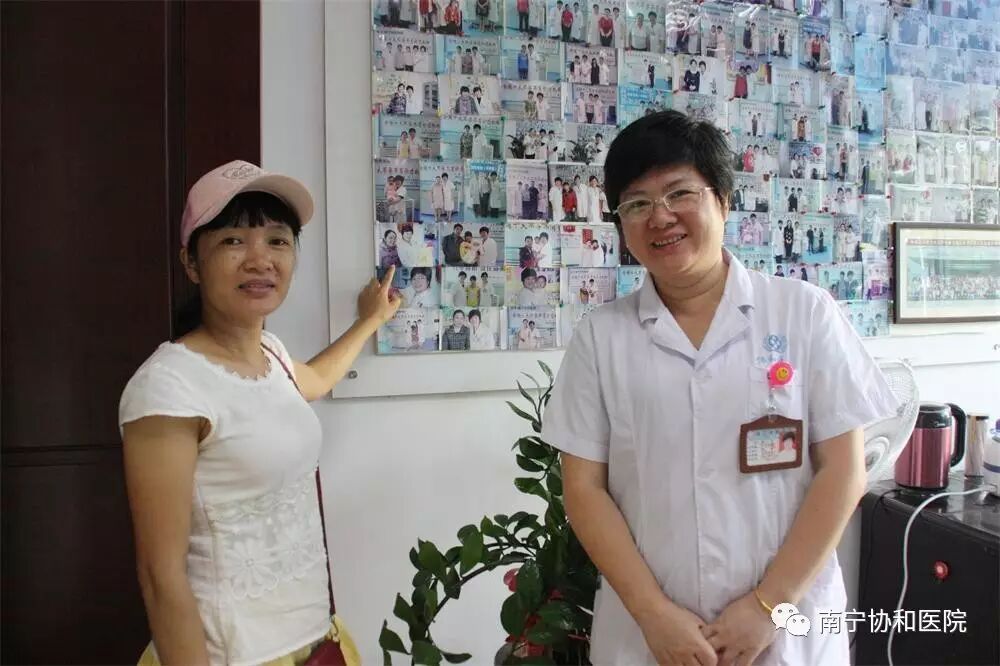 李女士指着报喜墙上当年抱着女儿和彭主任合影的照片给小编看