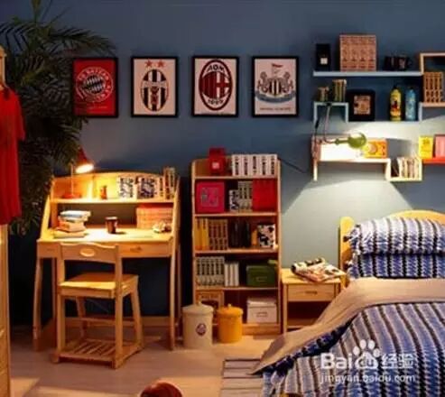 男孩房搭配贴士:男孩房的布置可以简单朴素,因为少儿期的男生呆在房间的时间其实很少,简单的实木床,搭配深色系的床品,再加上几件简单的家具就可以,其他可以让孩子自由发挥。