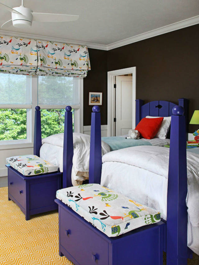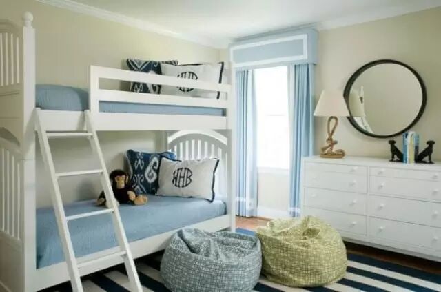 在岁龄较小的儿童房间里,可以在床尾增加一个小木椅子,防止孩子滑落。