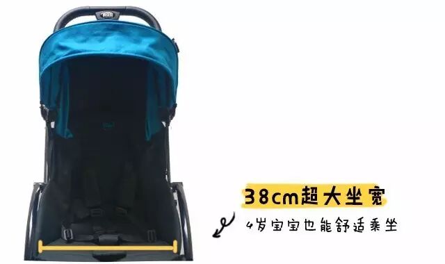 车身空间大,坐得更舒服。婴儿车座椅宽度一般是34cm,这款车的座椅宽度是38cm,比一般号称宽大座椅的还要宽,更别说那些挤得要命的小伞车。