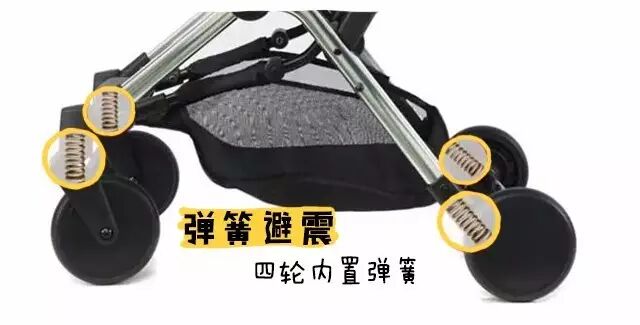 虎贝尔这款伞车,为了降低车重,没有使用到充气大车轮,而选用了实心小轮,但是,在轮子的材料上,使用了PU橡胶这种缓冲性理想的材料,而且还在4个车轮都安装了弹簧。