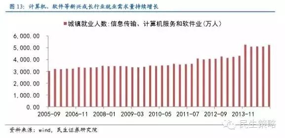 大量的新生人口将增加未来高素质的劳动力供给以及消费者数量,利于未来经济发展。从劳动力供给端看,大量新生人口在未来将增加劳动力供给,这将有助于解决劳动供应短缺的问题。更为重要的是,大量新生儿在未来将提供年轻、高素质的劳动力,这将更有利于未来经济的发展。因为我们预计未来经济增长将依赖产业升级转型及消费服务业大发展,产业升级及消费服务业发展需要年轻、高素质的劳动力供给,以计算机行业为例,近年来,就业人数持续增长,表明劳动力需求大。从消费者需求端看,大量新生人口未来将催生消费需求,有了源源不断的需求,消费业才能持续发展,以电影、游戏为例,随着群众消费意识增强,观影人次、游戏用户数近年来持续增长,未来行业发展需要不断补充的年轻消费者。