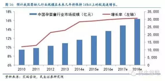 在新生儿成长的不同阶段,各消费行业将受到需求支撑。从消费角度看,新生儿的大幅增长将扩大居民消费,依据年龄增长,食品、衣着、教育文化娱乐、家庭设备用品、交通和通信、医疗保健等支出将陆续增加,相关行业需求将相继提振。据艾瑞咨询预测,在“单独二胎”政策下,2014至2018年,婴幼儿行业市场规模将由1.65万亿增长至3.02万亿,年均增长率约为16%,高于此前约12%的增速,因此二胎政策若全面放开,婴幼儿市场规模将进一步高速增长。