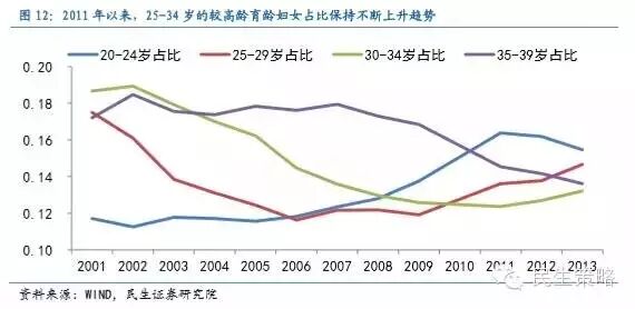 晚育造成第三次“婴儿潮”本应带来的“婴儿回声潮”没能如期出现。第三次“婴儿潮”(1981-1990年)中最晚出生的90年初新生儿在2015也已到达25岁,迈入婚育年龄。如果按照女生24周岁的晚育年龄计算,第四次“婴儿潮”本应出现在2005年以后。但2005年以后新增人口没有上升反而下降,我们认为这主要与生育年龄的推后有关,自1990年代起,20-24岁妇女生育率显著持续下降,25-29岁生育率在2006年起成为妇女最集中生育的年龄,同时30-34岁生育率自2001起持续上涨,晚育是造成第四次“婴儿潮”没有出现的主要原因。晚育我们认为主要是由于生活成本上升、婚育观念的转变造成的晚婚和生育年龄的推后。