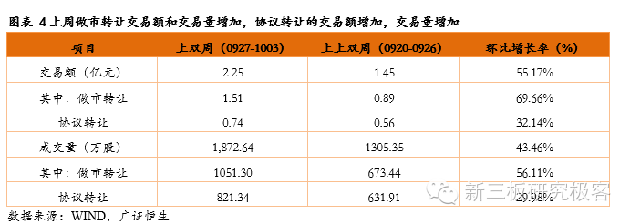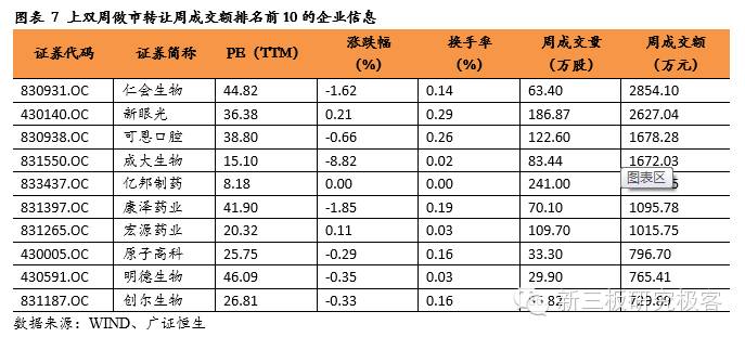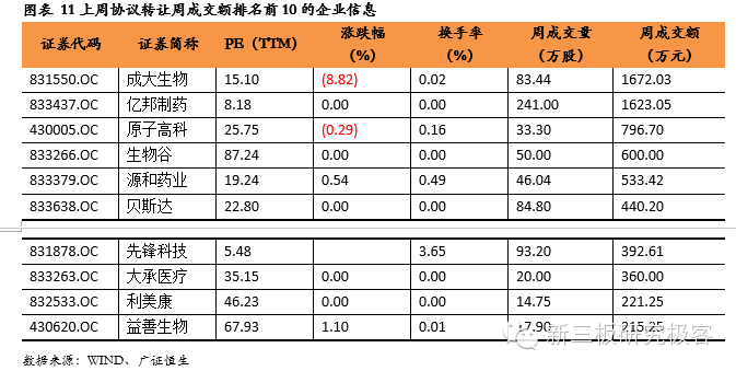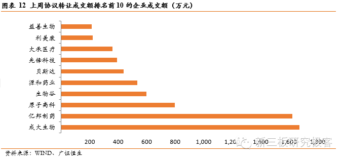 上升上个双周医药生物板块共有23家企业发生协议转让,占全部协议转让企业的12.99%。协议转让总成交量为821.34万股,较上上个双周环比上升29.98%;总成交金额为7429.36万元,占医药生物板块总交易额的33.04%,较上周环比上33.40%。上周成交额排名第一的是成大生物(831550.OC),公司周成交量为83.44万股,成交金额1672.03万元,约占全部协议转让成交额的22.51%。