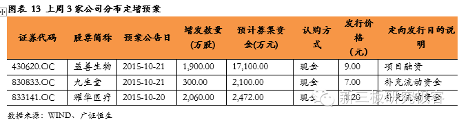 上升上两周新三板医药生物板块共有3家公司公布定增预案,计划融资2.17亿元。其中,益善生物(430620.OC)计划募集1,900万元,九生堂(830833.OC)计划募集2100万元,耀华医疗(833141.OC)计划募集2472万元。
