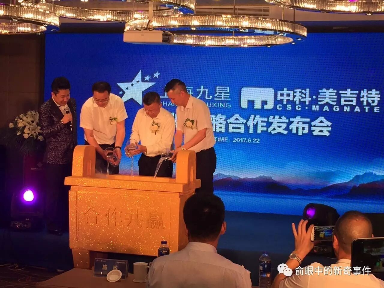 昆山市陆家镇镇长施敬(左二)、上海九星集团董事长吴恩福(左三)、美吉特集团董事长许斌(左四)共同启动合作金鼎