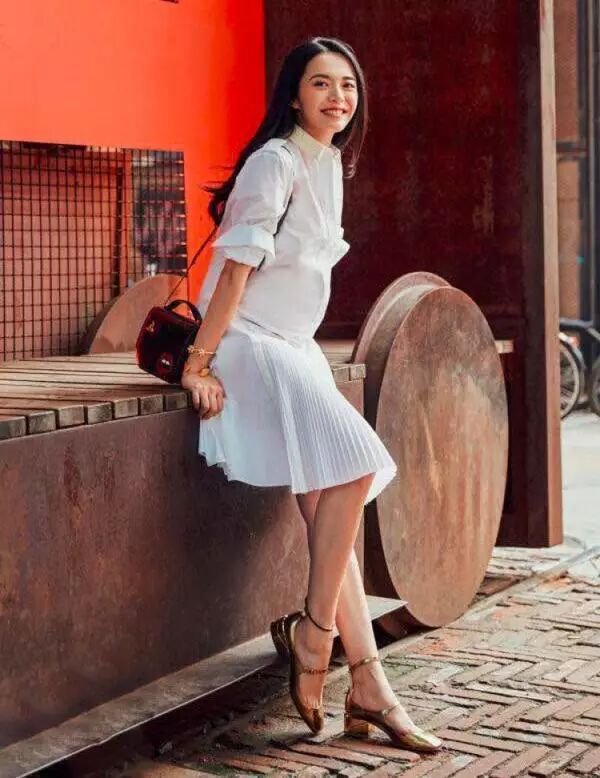 直筒的雪纺裙没有大裙摆的律动,但却把孕味修饰的恬静温婉。白色裙装+小白鞋,舒适又美腻。▼