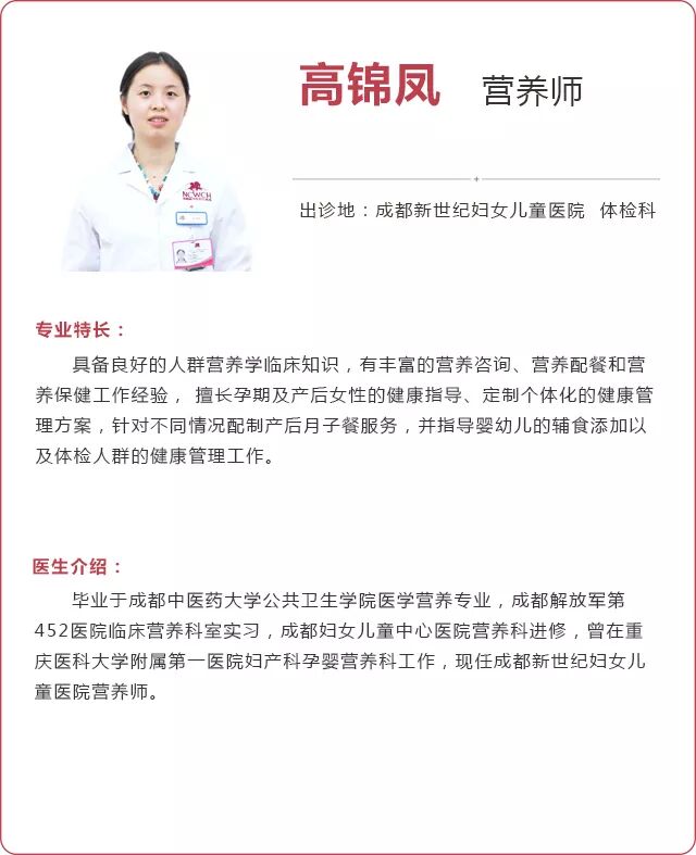 成都新世纪妇女儿童医院营养团队,由营养医师、营养师、全科医生、专科医生、护士、营养厨师组成,以专业呵护孕妈妈们的孕期健康,为孕妈妈提供专属的孕期营养服务。