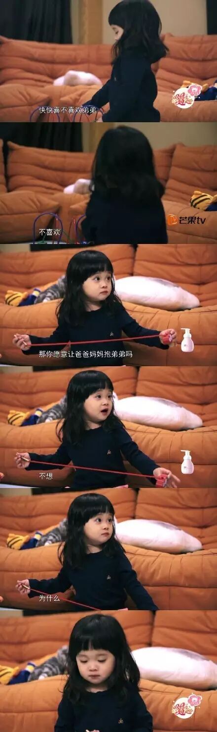 可以想象,快快经历了这一两种的落差,在弟弟没有出生之前,爸爸妈妈的视线、宠爱全部在自己身上,可以说受到了父母长辈众星捧月般的对待。在她还没有学会如何付出爱的时候,弟弟阳阳出生之后,因为弟弟年纪更小,更需要照顾,注意力难免会有所转移,比较之下,稍感冷落,这样,让快快比较缺乏安全感。