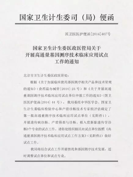 2014年3月,国家卫生和计划生育委员会发布了《关于开展高通量基因测序技术临床应用试点单位申报工作的通知》,希望通过试点形式规范和探索无创产前筛查在临床的应用。