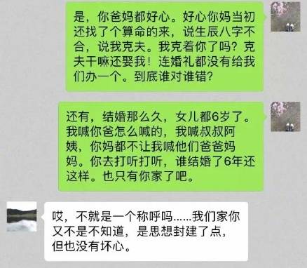 从两人的聊天中可以看出,结婚前,公婆就百般刁难。又是找人算命,说女方克夫,又是执意不办婚礼,故意作梗,又是婚后不许儿媳妇叫自己爸爸妈妈。
