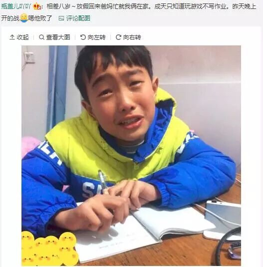 @瓶盖儿吖吖:相差八岁~放假回来爸妈忙就我俩在家。成天只知道玩游戏不写作业。昨天晚上开的战。嗯他败了