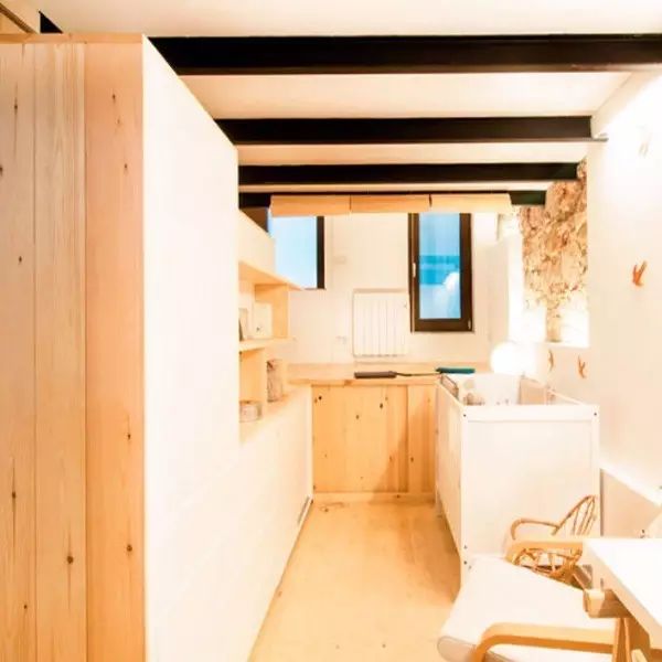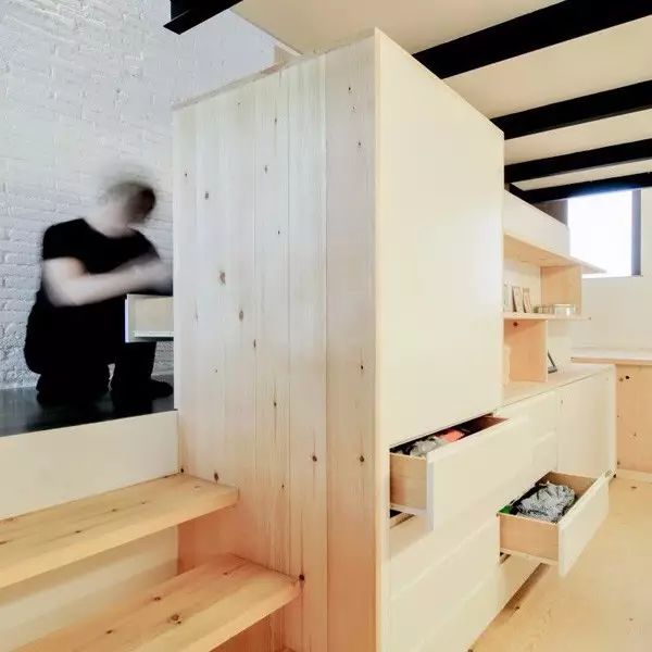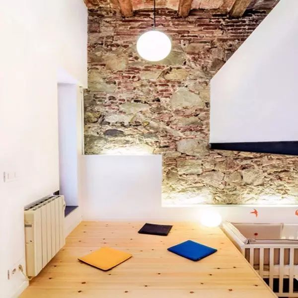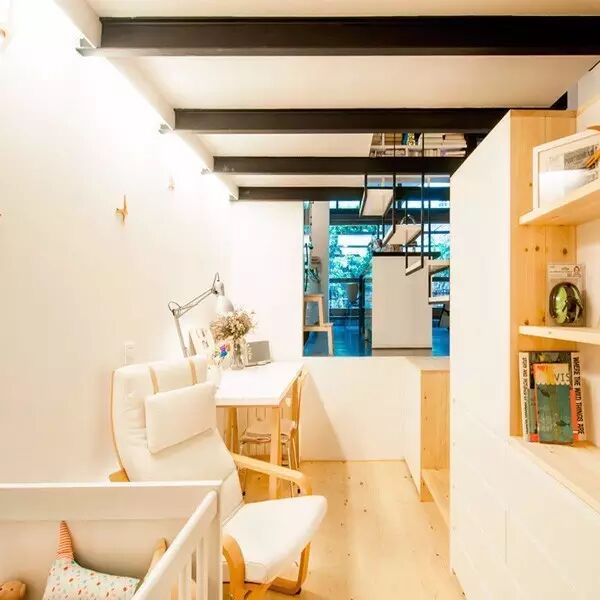 背景墙保留了装修前的模样,古旧简陋的墙壁为角落空间增添了工业风和复古风。储物柜作为婴儿房的收纳空间,其顶部与地面层持平,成为了走廊空间。因为吊顶足够高,所以走在上面也不会碰头。