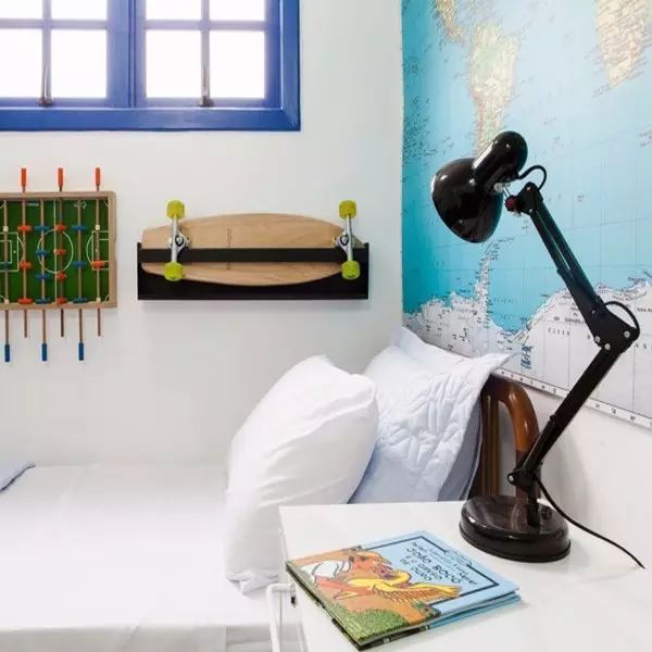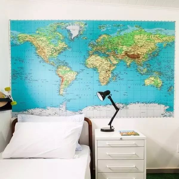 台灯当床头灯使用,移动方便,灵活性强,加上其小巧可爱的造型又为这简约的空间带来灵动美。地图装饰墙壁,美观的同时还可体现主人兴趣爱好。