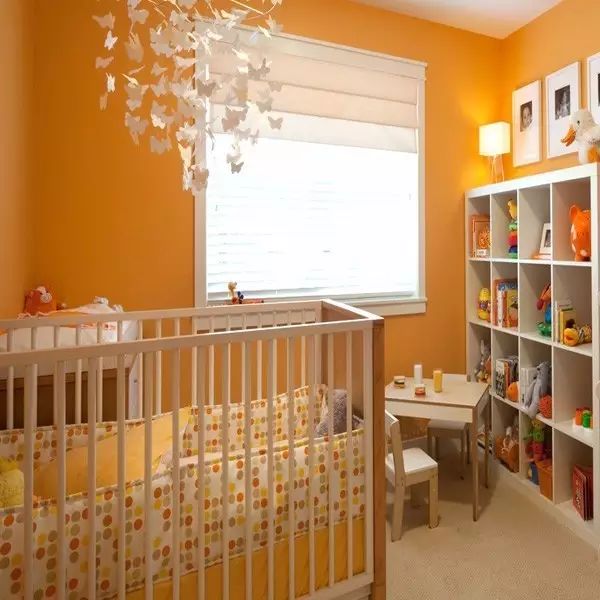 一个个格子组成的玩具柜,提高空间的收纳功能,拿取方便。而玻璃窗有提亮空间的作用,整体橙色基调搭配悬吊的装饰,给这温馨的空间增添些许灵动美和趣味性。