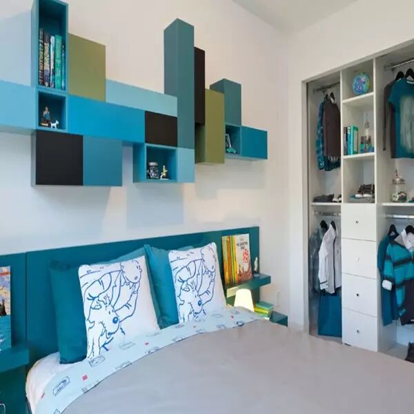 将大小不一的盒子随意组合,美化墙壁的同时还提高空间的的立体美和层次美。陈列架和柜子相结合的衣橱设计,则充分展现了衣橱的空间利用率,凸显空间强大的收纳功能。