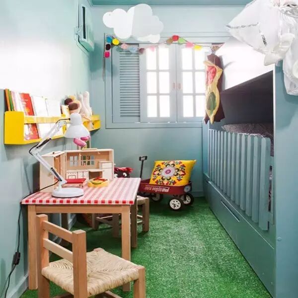 儿童床靠墙而放节省空间,栅栏式设计提高小床的安全性。而在走道上放置桌椅,则是不浪费任何空间位置的表现,木质的桌椅搭配绿色地板,相融相谐,尽添空间的自然风味。