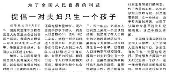 1980年党中央以公开信形式提倡“一对夫妇只生育一个孩子”。1981年3月6日,国家计划生育委员会设立,作为国务院常设机构。1982年党的十二大把实行计划生育确定为我国的一项基本国策。