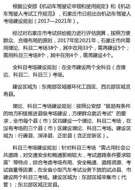 石家庄市日前出台机动车驾驶人考场建设规划(2017—2021年)。2017年至2021年,石家庄市共需用理论、科目二考场38个,其中在用33个,需再建设5个;需用科目三考场8个,其中在用4个,需再建设4个。
