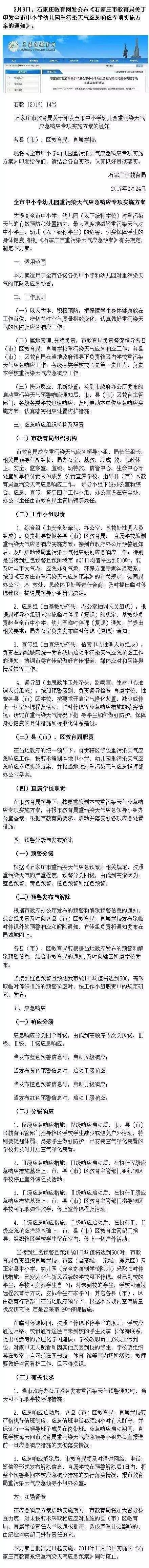 石家庄教育网发公布《石家庄市教育局关于印发全市中小学幼儿园重污染天气应急响应专项实施方案的通知》:当接到红色预警且预测AQI日均值将达到500时,市教育局负责组织直属学校、市区(含藁城、栾城、鹿泉区)及正定县中小学、幼儿园(完全寄宿制学校除外)采取临时停课措施,已安装空气新风系统的学校可不停课。当市政府办公厅紧急发布重污染天气预警通知时,当天可不采取学校停课措施。