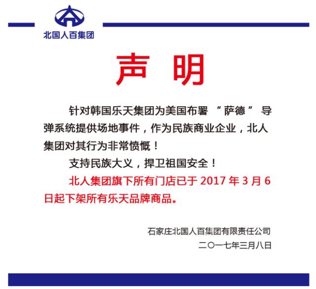 北人集团旗下所有门店下架乐天品牌商品的公告