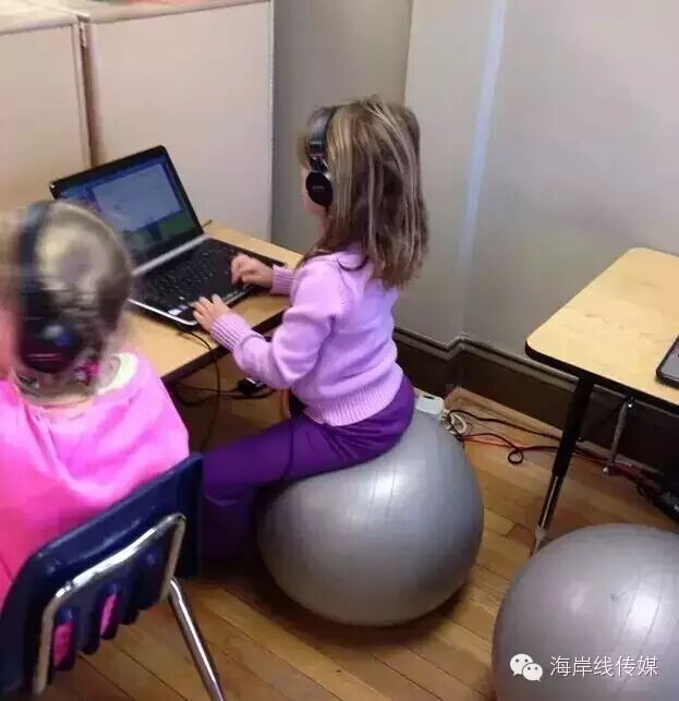 ▲让孩子坐着健身球写作业看书,能帮助他们集中注意力。