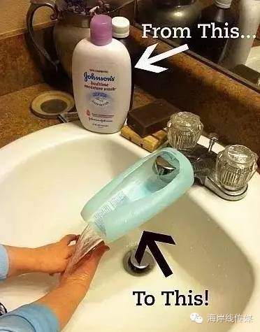 ▲用完的强生瓶子剪一剪就变成水龙头延伸器,小家伙们也能自己洗手了。