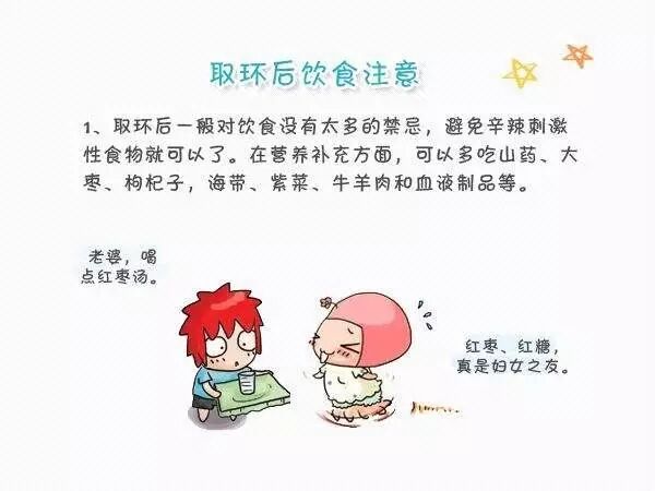 取环后还要注意少吃辛辣、酸食、生冷、等刺激性强的食物,保证每天身体所需要的营养,注意营养均衡,大补也并不是对每一个人都有益处。所以,保证清淡的饮食即可。