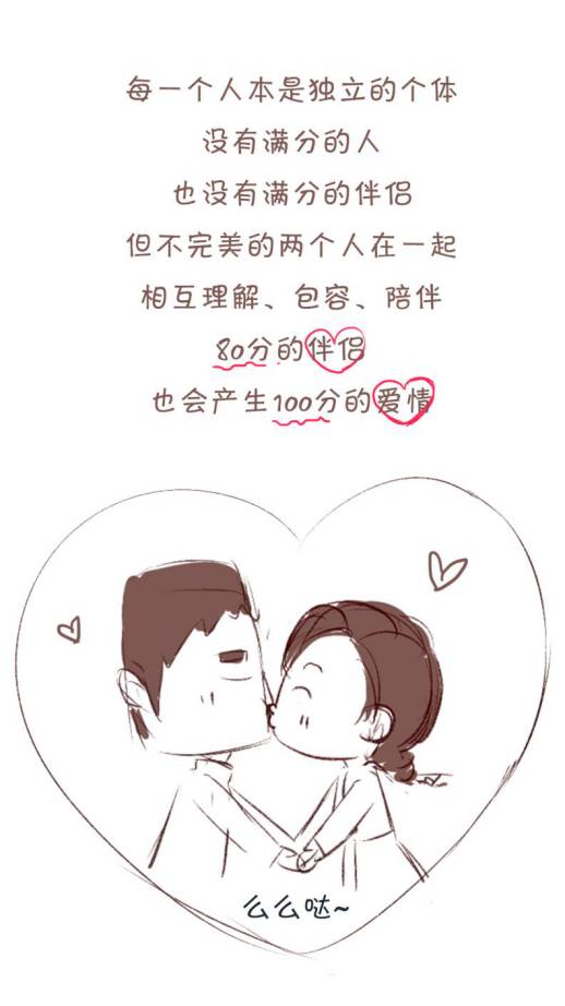 “没有满分的人,也没有满分的伴侣。但不完美的两个人在一起相互理解、包容、陪伴,80分的伴侣,也会产生100分的爱情。”