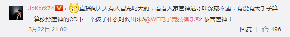 WE元老级上单选手草莓相信大家再熟悉不过了,“抗压王”、“路人王”、“一血定理”、“王草莓”都曾是他的标签。关注他的人,想必都知道,草莓和微笑一样,在打职业期间就有女朋友了,由于职业选手的身份,平时也比较低调,很少秀恩爱。